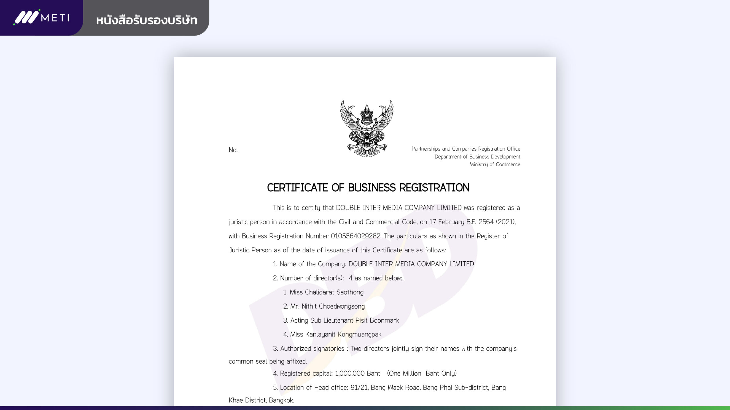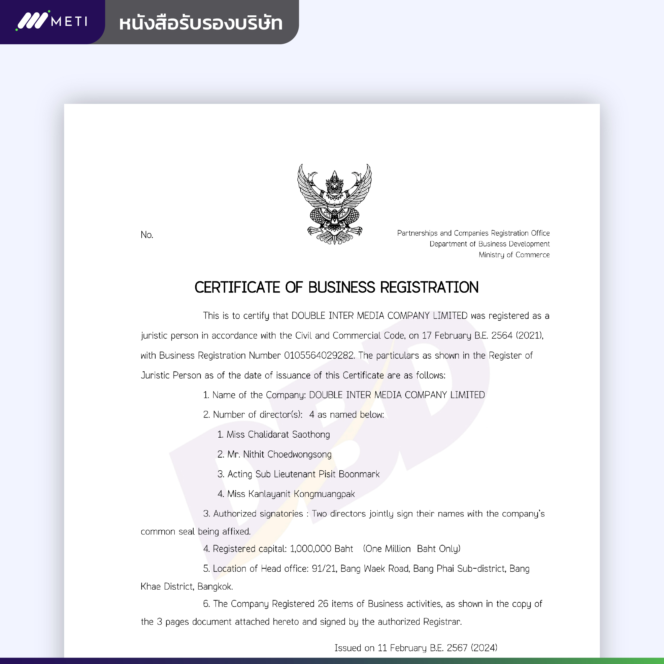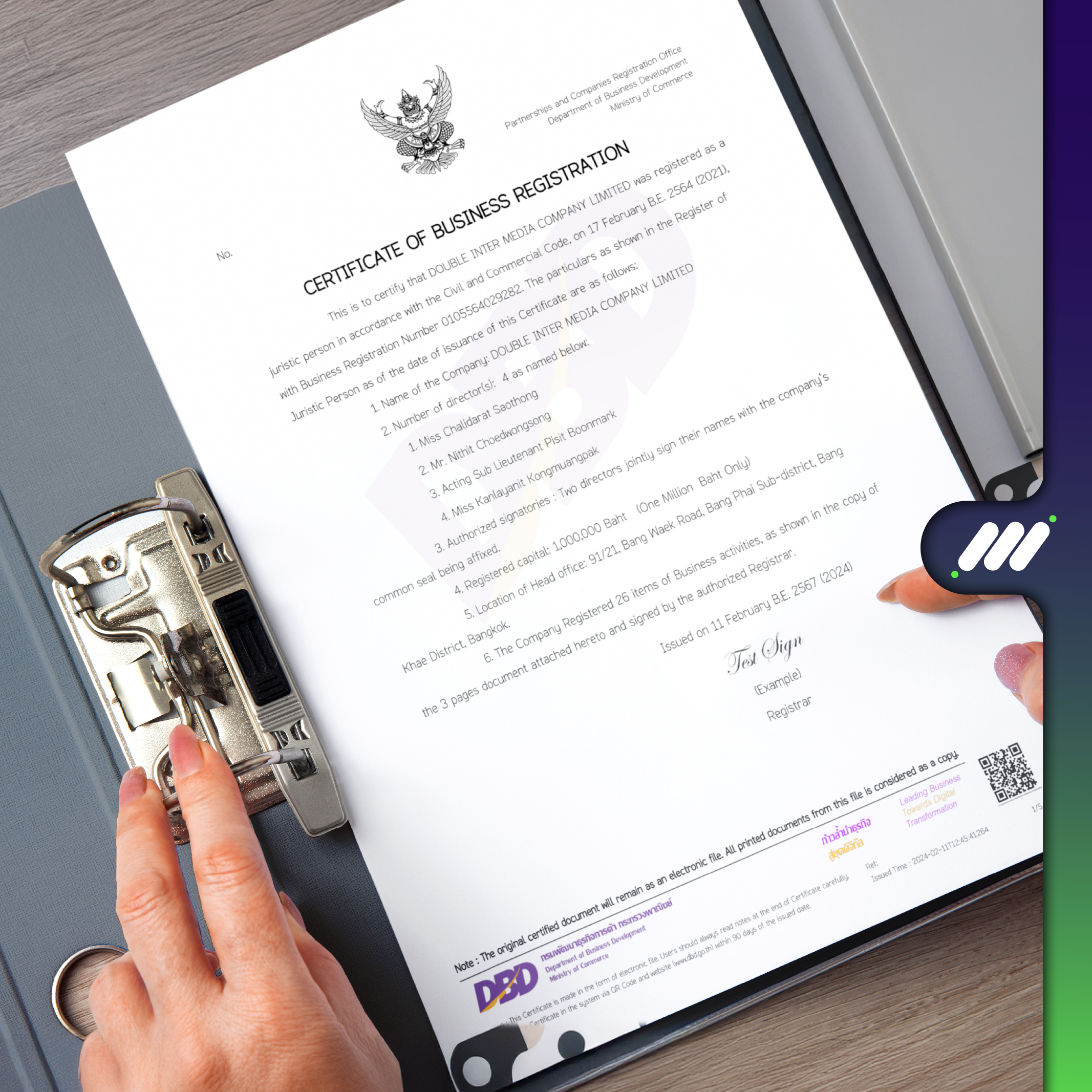 A Company Certificate is an official document issued by the Department of Business Development (DBD) to verify the legal status and identity of a company in Thailand. It serves as the company’s equivalent of a national ID card, confirming its legitimacy and credibility in business transactions.